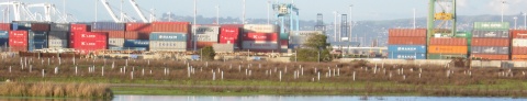 » White pipes indicating monitoring wells for underground remediation in Northwest Territories along Oakland Estuary. (Alameda Point Info photo)